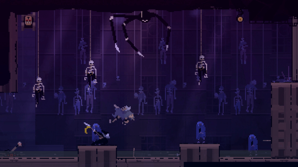 Eccoci quindi al gameplay, dopo avere illustrato la premessa del titolo. Olija si giocherà fondamentalmente come un action platform in stile MetroidVania, con aree che diverranno quindi accessibili solo dopo aver acquisito una particolare abilità o un altrettanto specifico potere. Quello che veramente distinguerà il titolo di Skeleton Crew dalla competizione, sarà proprio l’Arpione magico menzionato poco sopra, che avrà la duplice funzione di arma e di attrezzo che potrete utilizzare per avanzare nel gioco. Grossomodo come già accadeva in Final Fantasy XV, anche Faraday potrà lanciare l’arma per poi effettuare un dash nel punto in cui si è conficcata (a patto che sia presente un nemico o un globo di melma nera). Bloccati in un punto del livello? Pensate fuori dalla scatola e lanciate il vostro Arpione: spesso la soluzione sarà appena fuori dalla schermata di gioco. Un’altra peculiarità di Olija sarà da ricercarsi nel suo sistema di combattimento, ottimamente realizzato e soddisfacente, ed enfatizzato da comandi reattivi. Variegato anche l’arsenale di mosse a disposizione di Faraday per sbarazzarsi dei nemici: combo, attacchi volanti, attacchi smash (in caduta) a cui andranno a sommarsi le abilità specifiche dei vari copricapi che potrete forgiare al campo base (ognuno con distinte abilità), unitamente alle armi secondarie che potrete equipaggiare renderanno ogni scontro in Olija un fantastico turbinio di pixel. Niente da dire quindi sul lato del gameplay, Skeleton Crew ha dimostrato di saperci fare.