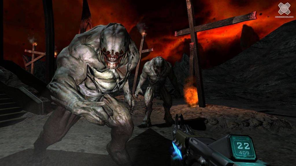 Anche i demoni presenti nei vecchi DooM saranno di ritorno. Imps, Cacodemoni, soldati e civili Zombie…tutti pronti a farvi saltare sulla sedia, con i loro attacchi e le loro apparizioni dai luoghi più impensati. Probabilmente anche voi, all’inizio del gioco, vedrete una scena che diventerà il concetto stesso di DooM3. Due imps che abbattono una porta corazzata di mezzo metro di spessore sono qualcosa di assolutamente agghiacciante. Giocare per credere. Perché tale avvenimento rappresenta un gioco intero? Semplice. In DooM, voi siete fondamentalmente e continuamente braccati. Praticamente qualsiasi mostro ha come unico obbiettivo VOI. E’ per questo motivo che l’ultraviolenza presente nel titolo è anche una delle maggiori fonti di gratificazione. Mettiamo il caso che due zombie e un Imp vi stiano inseguendo per i corridoi di Mars City e voi abbiate esaurito le munizioni del vostro fido fucile a pompa. Le trovate, e con due/tre colpi vi sbarazzate dell’Imp, che si accascia al suolo morente. Dopo poco arriveranno gli zombie, e con altri colpi li vedrete letteralmente SCARNIFICARSI…lasciandovi con una sensazione di enorme gratificazione. Li avete uccisi voi, ed eravate in svantaggio numerico, nonché indifesi. QUESTA è la soddisfazione di giocare a DooM3. E non è cosa da poco, sappiatelo.