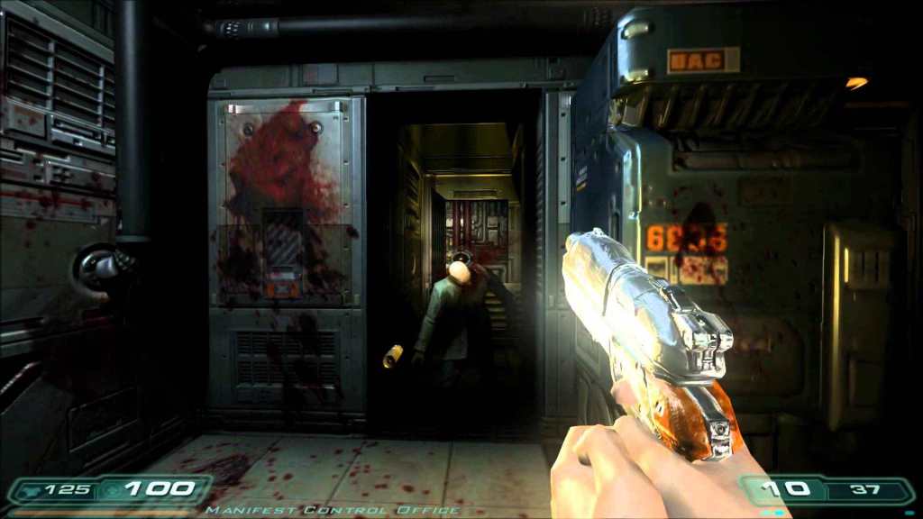 La horrorifica storia che fa da cornice a DooM 3, come avrete intuito, ha come sfondo Mars City, avamposto umano sulla superficie di Marte, il pianeta rosso. Mars City è un avanzato complesso scientifico/militare, sviluppato in joint-venture tra la Terra e la UAC (Union Aerospace Corporation), una multinazionale che si occupa di praticamente qualsiasi cosa possa fruttare soldi. Voi impersonate un non-meglio identificato Marine al suo primo giorno di lavoro su Marte. Siete in ritardo, e dovete recarvi dal sergente Kelly il prima possibile. Durante il tragitto, potrete parlare un po’ con chiunque, e il gioco vi introdurrà dolcemente nell’atmosfera generale mediante i PDA (Personal Data Assistant, delle sorte di palmari su cui ogni persona dell’impianto annota i propri files, o quant’altro). Leggendone alcuni, verrete a conoscenza di certi fatti non propriamente di buon auspicio. Gente scomparsa, soprattutto. Una volta raggiunto il Sgt. Kelly, e ricevuto il primo incarico (indagare su una persona scomparsa, appunto), inizierà finalmente DooM 3, una delle avventure più spaventose mai apparse sulla grossa X verde.