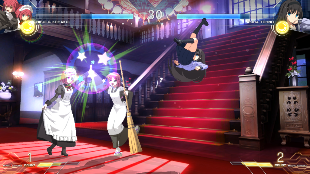 Veniamo ora al cuore pulsante di ogni picchiaduro: il roster. Ve lo diciamo da subito, preparatevi ad alcuni nomi dalla pronuncia davvero difficile. Type Lumina include i personaggi del remake di Tsukihime, cosa che comportarà l’assenza di diverse figure cardine dei precedenti quattro capitoli, in primis la co-protagonista Sion Eltnam Atnasia e il divertente joke-character Neco-Arc. Iniziamo quindi da Shiki Tohno, protagonista della serie sin dai tempi di Tsukihime, seguito da Arcueid Brunestud e della sua variante Red Arcueid: la prima è una dei signori dei vampiri, dotata però della possibilità di resistere alla luce del giorno e totalmente disinteressata al bere sangue, mentre la seconda è fondamentalmente Arcueid totalmente priva di ogni controllo e assoggettata alla sua natura vampiresca. Segue poi Akiha Tohno, l’elegante ed altolocata sorellastra di Shiki dotata di smisurati poteri magici… sarà colpa del sangue demoniaco che scorre dentro di lei? Sempre parlando di demoni, ecco Kouma Mishima, imponente guerriero dalla forza titanica nonché grappler del roster, e a seguire il duo di domestiche composto da Hisui e Kohaku: una seria, impassibile e di poche parole, l’altra estroversa, caciarona e dalla movelist decisamente bizzarra. Interessante notare come, oltre ad essere selezionabili singolarmente, le due ragazze possano anche essere utilizzate come tag-team, variando incredibilmente il gameplay. Sempre parlando di coppie, questa volta però selezionabili solo individualmente, troviamo Ciel e Noel, entrambe suore presso la Santa Chiesa e più precisamente con il ruolo di Boia/Carnefici, specializzate nell’eliminazione dei vampiri. Parlando di questi ultimi, ecco arrivare Vlov Arkhangel e Michael Roa Valdamjong, spietati succhiasangue con il primo a ricoprire il ruolo di arci-nemesi del gioco, ed infine impossibile non menzionare Miyako Arima, giovanissima lottatrice esperta di Baijiquan che considera Shiki il suo fratello maggiore. Chiude il roster la bionda ed adoratissima dai fan Saber, protagonista dei giochi della serie Fate (Fate/stay night, Fate/Grand Order, etc.). Aspettate, non è tutto: gli sviluppatori hanno inoltre pubblicato 2 DLC gratuiti per il loro titolo con altri 2 in arrivo a brevissimo, tra cui Aoko Aozaki, maestra di Shiki nonché nostro personaggio preferito, Dead Apostle Noel, Mario Gallo Bestino e Powered Ciel!