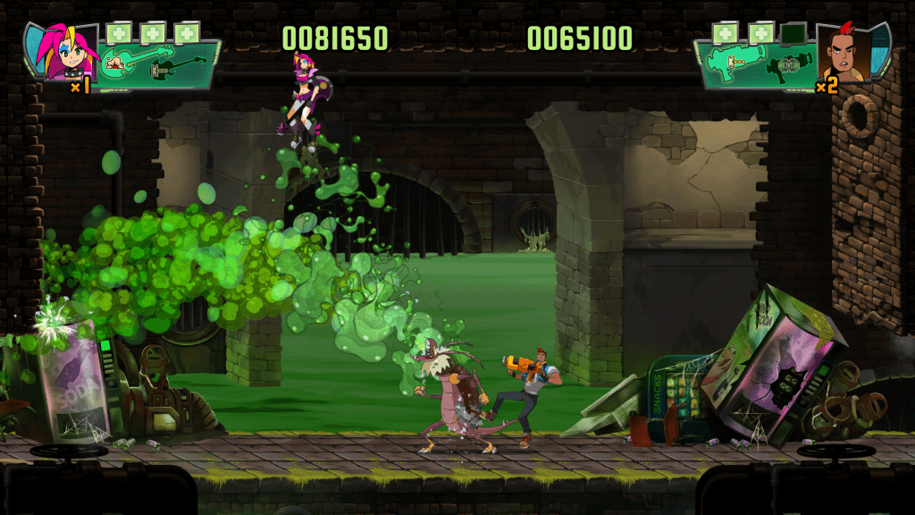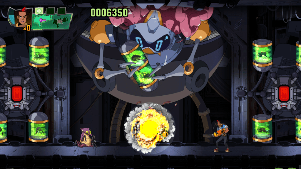 Come avete letto poco sopra, Spidersaurs é fondamentalmente il Contra di Konami in salsa WayForward: Sebbene questi personaggi si muovano allo stesso modo, ognuno di loro ha accesso ad armi diverse. Mentre il laser arma Victoria con laser perforanti, Adrian riceve un lanciafiamme; lo spreader è uno sparo a tre vie standard per Victoria, ma quello di Adrian spara un grande proiettile che si divide in tre sul rimbalzo. Questo vi darà un motivo per provare entrambi i personaggi per situazioni diverse. I personaggi si muovono come Contra; hanno lo stesso salto di Bill e Lance, i potenziamenti delle armi arrivano e volano fuori dallo schermo e si perdono alla morte, potrete sparare in qualunque direzione ma soprattutto è brutalmente difficile. Il gioco si svolge in sei fasi, ciascuna con un boss centrale e un boss finale. Questi boss intermedi fungono da checkpoint permettendovi di tornare al livello anche nel punto intermedio. Quindi, se trovate che la prima metà sia più facile come Victoria, potrete completare il resto come Adrian e viceversa. A volte abbiamo trovato la difficoltà un po’ incoerente, dobbiamo ammetterlo, con alcuni livelli ben più difficili di altri.