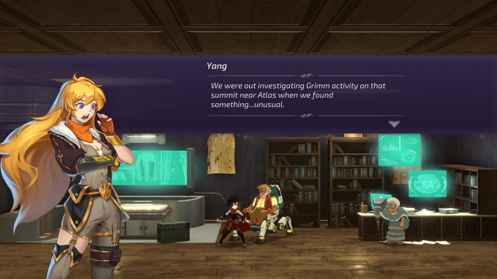Questa volta, le due compagnie hanno fatto squadra per portare sugli schermi delle nostre console un gioco dedicato a RWBY, popolare anime occidentale (poi divenuto famoso anche nel Sol Levante) ideato da Rooster Teeth e nato come web-series, ora alla nona stagione. Vale la pena notare che RWBY: Arrowfell si svolge nel mezzo del volume 8 della serie animata, quindi per coloro che non sono coinvolti nella serie o sono interessati, ci saranno spoiler che faremo del nostro meglio per non toccare in questa recensione. Con questo in mente, la storia segue il cast principale delle cacciatrici Ruby, Weiss, Blake e Yang nelle loro avventure nella ricca città galleggiante di Atlas e nella città di Mantle. Sfere misteriose hanno iniziato a spuntare intorno alla città e nelle aree esterne che sembrano avere il potere di evocare i Grimm, le creature malvagie che popolano il mondo. Spetterà quindi al team RWBY scoprire e aiutare a fermare quello che sta succedendo per mantenere Atlas e Mantle al sicuro. Sebbene la maggior parte della storia sia raccontata attraverso semplici caselle di testo, ci sono un certo numero di casi in cui potremo assistere a filmati animati con lo stesso stile artistico della serie che aiutano a mostrare i momenti più importanti.