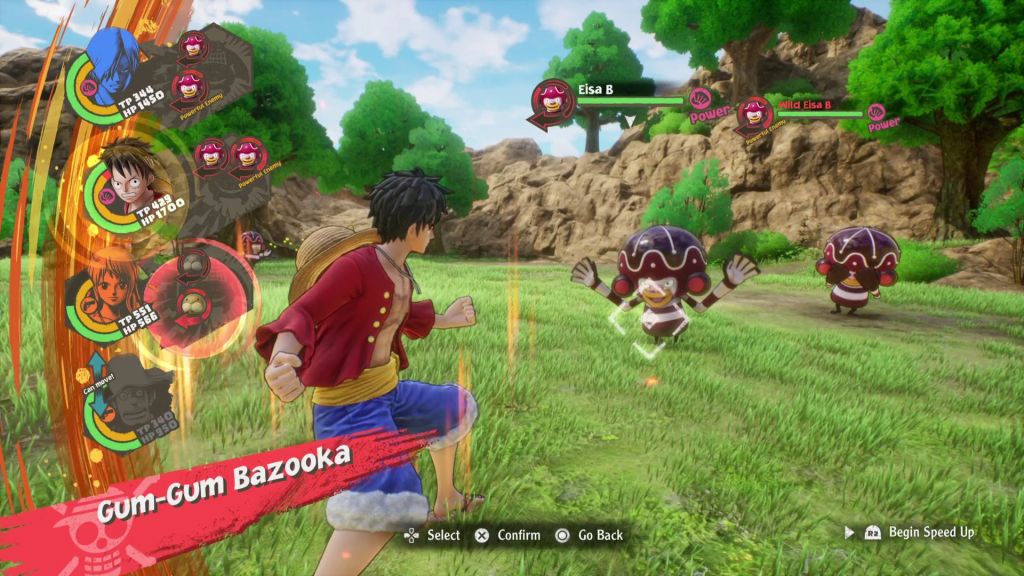 Veniamo ora al sistema di combattimento, decisamente uno dei punti forti dell’esperienza. One Piece Odyssey funzionerà come ogni buon JRPG classico a cui abbiate giocato negli ultimi anni. Il vostro party (composto da quattro personaggi alla volta ma con la possibilità di scegliere chi far entrare in azione praticamente ad ogni momento) attaccherà i nemici secondo uno schema “a turni”. Vi sarà possibile scegliere tra attacchi normali oppure utilizzando una delle tantissime abilità iconiche dei vari personaggi: Luffy potrà contare ad esempio su tecniche quali il Gom Gom Gatling, il Gom Gom Bazooka e via dicendo, così come Zoro potrà utilizzare le sue tecniche di spada (Oni Giri ed altre). E’ tutto molto semplice e funziona egregiamente. Dove però Odyssey si differenzia dagli altri JRPG sarà nella presenza delle “aree”. Invece di raggruppare i nemici in una singola zona o arena, il gioco li piazzerà in luoghi differenti, costringendovi ad attaccare secondo un certo criterio: preferite soffocare la resistenza nemica concentrando i vostri personaggi nella stessa zona dei nemici, o preferite un attacco più variegato, tenendo alcuni dei vostri personaggi relativamente al sicuro e sacrificando un po’ di potenza d’attacco? Ci é piaciuto molto questo approccio, specialmente se teniamo in conto la terza caratteristica del sistema di combattimento di Odyssey, ovvero una sorta di meccanica sasso-carta-forbice (nel gioco potenza-tecnica-distanza) che andrà a giocare un ruolo ancora più cardinale nella strategia che dovrete adottare contro i vostri nemici, specialmente, contro i boss di fine capitolo.
