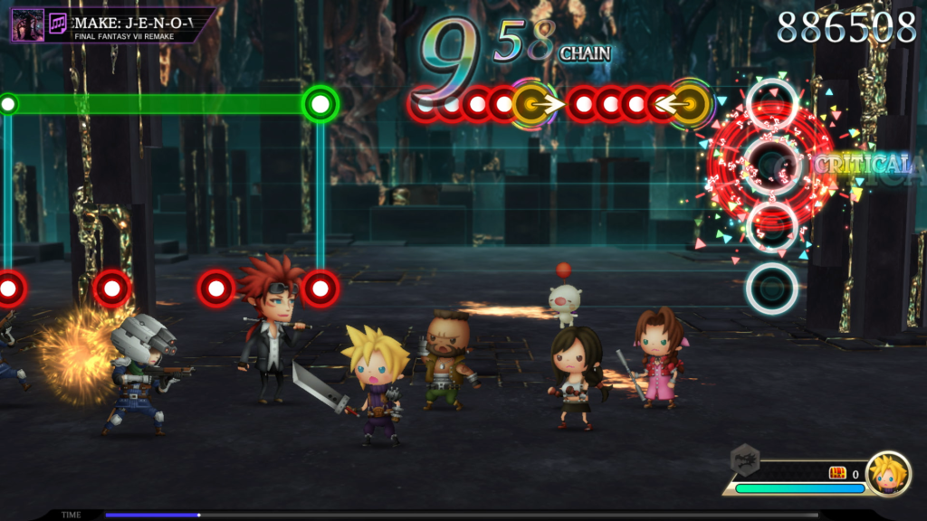 Theatrhythm ha sempre incorporato meccaniche di gioco di ruolo per aiutare il giocatore a superare il traguardo, specialmente se le vostre performance ritmiche sono… inconsistenti, per usare un termine non volgare. Costruire un party dei costituito dagli eroi e dai cattivi preferiti di Final Fantasy con le giuste abilità può fare la differenza tra successo e fallimento. I personaggi rientrano in varie classi, ognuna con vantaggi unici a metà canzone. Alcuni vi aiuteranno a sconfiggere i nemici nelle fasi, altri ridurranno i danni quando mancano le note o ripristineranno i vostri HP, e alcuni vi aiuteranno a raccogliere più ricompense o rafforzare altri personaggi. Far salire di livello i personaggi è fondamentale in quanto migliorerà le loro statistiche e aumenterà drasticamente le vostre probabilità di successo. Ad esempio, completare una canzone difficile è molto più facile con i 2700 HP che Cloud possiederà al livello 99 contro i 550 HP di quando è al livello 18. L’unica nota stonata (ah-ah! NdR) della modalità Series Quest è che oltre a sbloccare canzoni e personaggi per altre modalità, non c’è una storia o altro oltre alla musica stessa. Inseguire punteggi più alti può essere molto divertente, ma si sarebbe senza dubbio potuto far di più. C’è una modalità Endless che si sblocca dopo aver completato tutte le 29 serie, ma alla fine è più o meno la stessa, con l’unica differenza che sarete chiamati a completare quante più canzoni di fila prima di perdere le vostre tre vite per aver fallito una canzone.