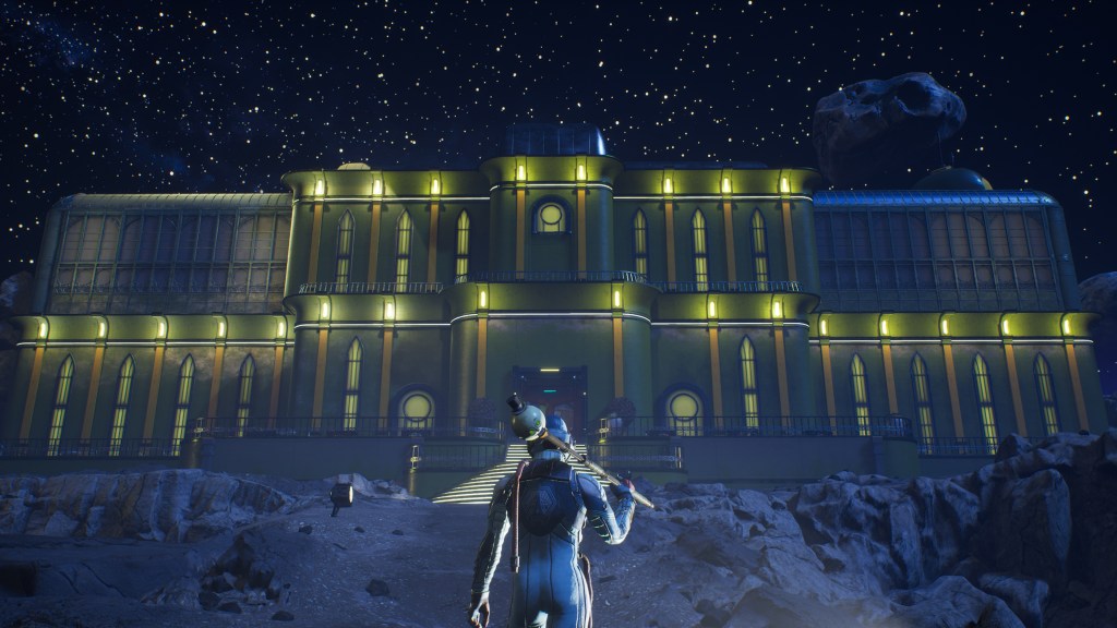 Il punto cruciale di questa configurazione fantascientifica è che, tra le altre cose, il sistema Halcyon è di proprietà e gestito interamente da un consiglio di Società e la loro presenza è un grosso problema. Interi pianeti sono di proprietà di corporazioni che cercano di utilizzare i loro ecosistemi come parte di una catena di approvvigionamento più ampia, e numerosi distributori automatici di diverse aziende popolano le città, cercando di attirarvi con i loro loghi luminosi e jingle. In effetti, The Outer Worlds è saturo di luoghi straordinariamente colorati; i pianeti che visiterete sono straordinariamente vari e belli, in grado di stupire con un’estetica retro-futuristica simile a quella idealizzata da H.G. Wells, l’antitesi del cupo cyberpunk tanto in voga oggigiorno.