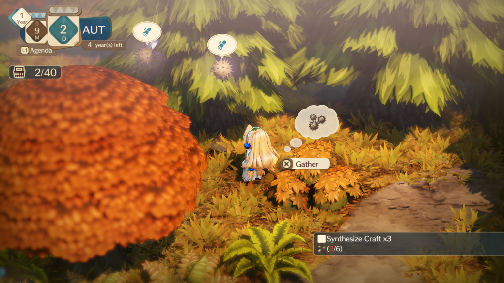 Qualcosa di fondamentale nelle meccaniche di Atelier Marie è il concetto di gestione del tempo. Quella scadenza di cinque anni non è solo un espediente della trama per la storia, ma permeerà quasi tutto ciò che potrete fare. Tutte le attività hanno un costo in termini di tempo, che può variare da un singolo giorno a più di una settimana. Ad esempio, se volete andare in una foresta vicina per raccogliere materiali, non solo vi ci vorranno alcuni giorni solo per arrivarci, ma vi costerà letteralmente un giorno ogni volta che attingerete da un punto di raccolta o combattete contro un nemico. Dopodiché, al vostro ritorno, vi occorreranno altri giorni per sintetizzare i materiali in una nuova miscela. Settimane e mesi quindi si sciolgono in pochi minuti di tempo reale, il che può essere fuorviante quando le scadenze che sono “solo” a un mese o due di distanza si profilano imminenti su di voi in un batter d’occhio. All’inizio, ci siamo ritrovati a fallire alcune missioni perché le loro date di scadenza si avvicinavano fin troppo repentinamente. Dopo un po’, abbiamo iniziato a sviluppare un’idea di quanto tempo ci volesse per completare le varie attività, ed è diventato più facile pianificare un’agenda e ottimizzare meglio il tempo. Coloro a cui non piace sentire la pressione del tempo possono giocare in una (nuova) modalità illimitata che rimuove la scadenza di cinque anni se lo desiderano, ma continuerete a lottare per rispettare le scadenze per le missioni. Detto questo, nonostante la gestione del tempo sia una parte fondamentale dell’esperienza, siamo rimasti colpiti dal feeling rilassato di l’Atelier Marie. Anche quando giocate con la scadenza di cinque anni, sembra che il gioco sia estremamente indulgente in relazione allo scadenziario delle varie missioni. Prima di proseguire, due parole sul sistema di combattimento: Innanzitutto sappiate che non è sicuramente una delle priorità di questo gioco, con gli scontri che dureranno al massimo pochi secondi. Detto questo, Marie ed altri due partner dovranno gestire la posizione sul campo di battaglia così da poter ottenere il meglio dalle loro performances. Il combattimento è funzionale, ma nulla più, e offre più che altro una distruzione dalle altre meccaniche principali (raccolta ingredienti e creazione).