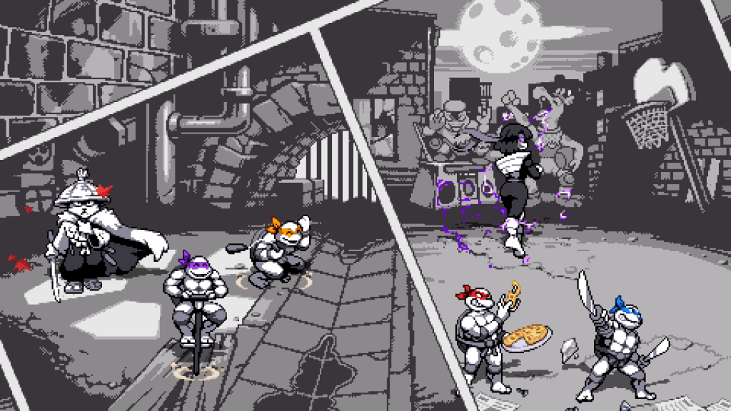 Salterete in una delle cinque nuove dimensioni: quella retrò “campo di battaglia a 8 bit” e gli ambienti di “Mirage” ispirati ai fumetti sono straordinari, tra l’altro. Ad ogni modo, dovrete eliminare un’ondata di nemici e tentare di raccogliere abbastanza frammenti per completare un cristallo dimensionale e progredire nella prossima area. Quando morirete (perché lo farete, e spesso), i vostri cristalli verranno conteggiati e produrranno aggiornamenti per la vostra prossima run. La struttura è ripetitiva per via della sua stessa natura, ma una meccanica bonus alla fine di ogni onda mantiene le cose interessanti. Prima di lanciarvi nella prossima battaglia, vi verrà data una scelta tra due aggiornamenti tra cui più frammenti, salute, strani power-up o la possibilità di mutarsi in alcuni cattivi classici per un breve periodo. Questi varieranno nella loro utilità: giocando come Shredder, Bebop e Rocksteady darete un po ‘di tregua alla salute decrescente del vostro combattente, sebbene il moveset limitato dei cattivi li faccia apparire un po’ lenti rispetto alla fluidità delle tartarughe. Il sistema è semplice ma versatile e interessante: Giocherete al sicuro e raccoglierete un bonus per la salute in ogni occasione, o vale la pena prendere un fascio di frammenti per garantire una rapida progressione? Con diverse battaglie con boss gettate casualmente nella gamma di onde nemiche, la vostra scelta di bonus può significare il successo o la fine di una intera run.