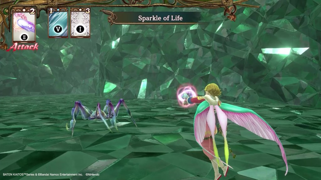 Ora, il gameplay. Chiaramente dovendo coprire due titoli non potremo scendere nel dettaglio, ma faremo comunque il nostro meglio per darvi una infarinatura su cosa potrete aspettarvi. Per essere un JRPG, Baten Kaitos introdusse meccaniche di gioco all’epoca decisamente avant-garde. Quando vengono ridotti al loro minimo comun denominatore, i due Baten Kaitos sono giochi di carte con una rifinitura davvero impressionante e, in Origins così come nel gioco originale, i giocatori costruiranno mazzi, troveranno nuove carte e combatteranno contro i cattivi utilizzando la loro collezione personalizzata. Origins tuttavia semplificò il design, eliminando la possibilità di equipaggiare armature o accessori al di fuori della battaglia. Invece, tutti i magnus verranno utilizzati per momenti chiave del gioco (come risolvere enigmi) o come “magnus di battaglia” che possono essere composti da carte di attacco, incantesimi, equipaggiamento o potenziamenti di attributi.