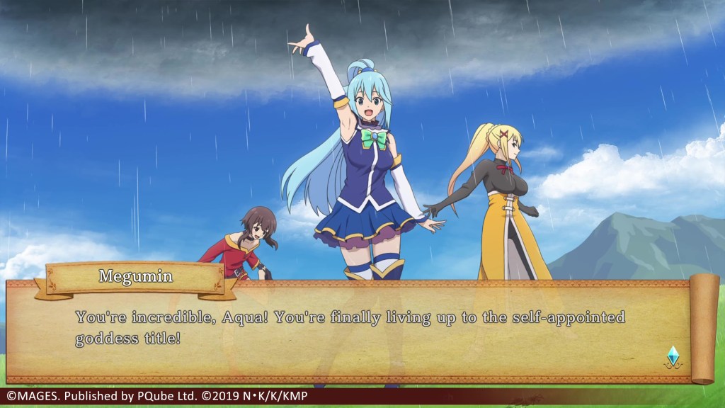 Prima abbiamo chiamato gli eroi di questa avventura dei casi umani. Volevamo scrivere una battuta, ma in tutta onestà, col senno di poi non abbiamo mancato il bersaglio di tanto. I personaggi di KONOSUBA sono infatti tutti caratterizzati divinamente. Kazuma é un ex-hikikomori/NEET, cinico e scontroso, che sta letteralmente vivendo il sogno della sua vita (essere trasportato in un mondo fantasy paragonabile ai JRPG e agli MMORPG che giocava prima del trapasso), Aqua é una (ex?)divinità con un serio problema di alcolismo, Megumin é una ragazzina che si considera una adulta con un probabile futuro da piromane e infine Darkness, la nostra preferita, oltre ad essere totalmente inutile come cavaliere crociato, é anche vittima di una terribile fantasia erotica masochistica in cui sogna di essere maltrattata verbalmente da Kazuma e massacrata dai nemici. Fidatevi, raramente ci é capitato di ridere sguaiatamente giocando ad un videogioco, ma KONOSUBA é uno di quei titoli che ci é riuscito. Ogni avventura sarà un pretesto per tirare in ballo una o più delle problematiche sopramenzionate, in un modo scritto divinamente e totalmente in linea con lo humour della serie.