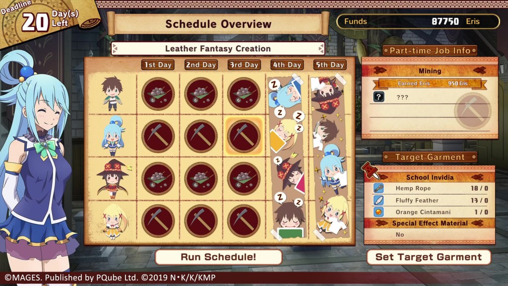 In termini di gameplay, a conti fatti, non é che ci sia da scriverne più di quel tanto. KONOSUBA é infatti una visual novel nel senso più canonico del termine, ovvero dialoghi su dialoghi alla pari del guardare un anime (KONOSUBA, ad esempio. NdR) o leggere un buon manga (KONOSUBA, ad esempio. NdR). Questo non vuol dire però che l’unica cosa che dovrete fare sarà premere X per fare avanzare il dialogo alla successiva linea di testo. Il gioco ruota infatti attorno al completamento di missioni e alla raccolta di ingredienti per generare vestiti necessari per rispettare le scadenze e soddisfare i desideri delle tre eroine principali (Aqua, Megumin, Darkness), nonché eventi specifici dedicati alle quattro co-protagoniste (Chris, Wiz, Yunyun, Sena). KONOSUBA è un gioco di gestione del tempo in cui, giocando nei panni di Kazuma, pianificherete cosa fa ciascuno dei membri del gruppo durante una settimana di cinque giorni. Il gruppo guadagnerà denaro e ingredienti eseguendo lavori o missioni per i primi tre giorni, possibilmente partecipando a eventi speciali quando si riposano nel quarto e acquistano ingredienti per generare vestiti il quinto. L’obiettivo del gioco è acquisire ingredienti sufficienti per generare un capo di abbigliamento entro una data limite, altrimenti il gruppo dovrà fuggire dalla città nel cuore della notte o, nel caso più estremo, venire giustiziati. È inoltre possibile creare indumenti opzionali per ottenere varie ricompense e sbloccare artwork specifici, e l’utilizzo di ingredienti aggiuntivi può apportare variazioni agli eventi che ne risulteranno.