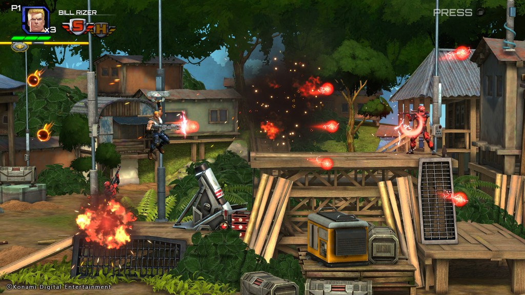Passiamo al gameplay, dove possiamo già affermare che questo C:OG supera il test a pieni voti. Per iniziare avrete a disposizione, di default, un doppio salto, oltre a una manovra di scatto che potrà essere utilizzata a terra o a mezz’aria. Insieme, queste due abilità vi renderanno molto più agili nello schivare il fuoco nemico, vi lasceranno più spazio di manovra quando dovrete superare le sezioni platform e trasformeranno il combattimento in un’esperienza più rapida e acrobatica. Per quanto riguarda il vostro arsenale, nonostante C:OG prenda in prestito le armi più iconiche dei primi tre giochi (mitragliatrice, sparo a diffusione, laser, lanciafiamme, missile a ricerca e “Crush”, una sorta di granata a grappolo. NdR), anche qui troveremo diverse modifiche. Ogni singola arma tra quelle sopracitate comporta un notevole aumento di potenza rispetto alla vostra arma predefinita, ma ognuna di esse potrà anche essere aggiornata raccogliendone una seconda dello stesso genere. Raccogliere un altro potenziamento per il Missile a Ricerca quando ne avete già uno equipaggiato lo renderà, ad esempio, un Missile a Ricerca Lv 2. A volte questo estenderà la portata o la diffusione dell’arma, come nel caso dello Sparo a Diffusione e del Lanciafiamme, mentre altre volte cambierà il comportamento di un’arma in modo più significativo. Un Laser potenziato rimbalzerà sui bersagli, mentre il Crush potenziato trasforma l’arma da una granata a grappolo a un’arma da fuoco che apre piccoli buchi neri in grado di causare danni continui. E con un gradito miglioramento della qualità della vita, raccogliere una nuova arma riempirà automaticamente uno slot per armi vuoto, nel caso.
