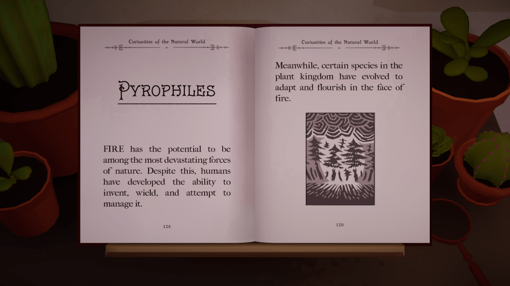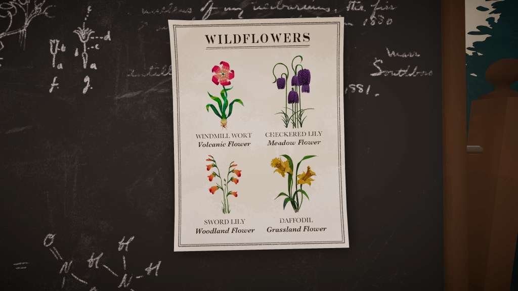 Ad esempio, raccogliendo il primo pacchetto di semi sul banco di invasatura si rivela l’impronta di una pianta immaginaria chiamata Windmill Wort, con tre slot per altrettanti indizi in attesa di essere trovati nelle vicinanze. Fin dall’inizio, era evidente che questi indizi non solo avrebbero aiutato a risolvere l’enigma, ma avrebbero anche messo insieme una storia molto più ampia su Arabella e il maniero in cui vive. I grafici del calore e dei fiori selvatici su una lavagna vi aiuteranno a capire la temperatura giusta per coltivare il Windmill Wort, che é poi sbocciato in un delizioso fiore rosa che girava letteralmente come un mulino a vento e che ha aiutato ad eliminare lo smog presente nella stanza, collegandolo elegantemente a un giornale abbandonato sul tavolo che discuteva i problemi ecologici della recente industrializzazione dell’epoca.