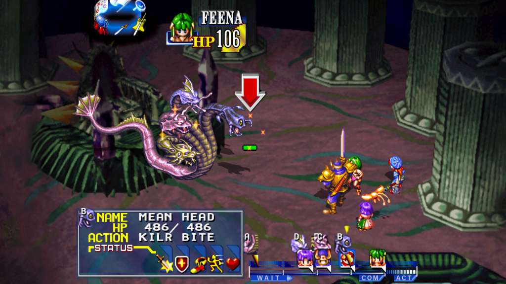 Uno dei motivi, anzi, IL motivo principale per cui Grandia raggiunse la sua fama di culto fu grazie al suo sistema di combattimento, che si rivelò rivoluzionario per l’epoca e che ancora oggi è uno dei migliori sistemi di combattimento che ci sia capitato di utilizzare in un JRPG. Le battaglie in entrambi i giochi si svolgono in tempo reale con una variazione del famoso sistema ATB della serie Final Fantasy, in cui tutti i partecipanti, sia i vostri eroi che i nemici, hanno le loro azioni governate da un indicatore condiviso nella parte inferiore dello schermo. Ognuno é rappresentato da un’icona che si muove lungo l’indicatore a velocità diverse e, dopo aver percorso circa tre quarti fino alla fine, un personaggio può quindi selezionare l’azione successiva, che però non verrà finalizzata finché la sua icona non raggiungerà la fine del percorso. Le cose qui si fanno interessanti, tuttavia, perché i personaggi saranno vulnerabili in quel “tempo di lancio” tra la selezione e l’esecuzione di un’azione, e questa vulnerabilità può essere sfruttata per ritardare o negare completamente l’azione che si stava tentando. Quindi, ad esempio, se un nemico si sta preparando per un attacco e riuscite a colpirlo prima che possa metterlo in atto, annullerete la sua azione e lo rispedirete indietro sulla barra.