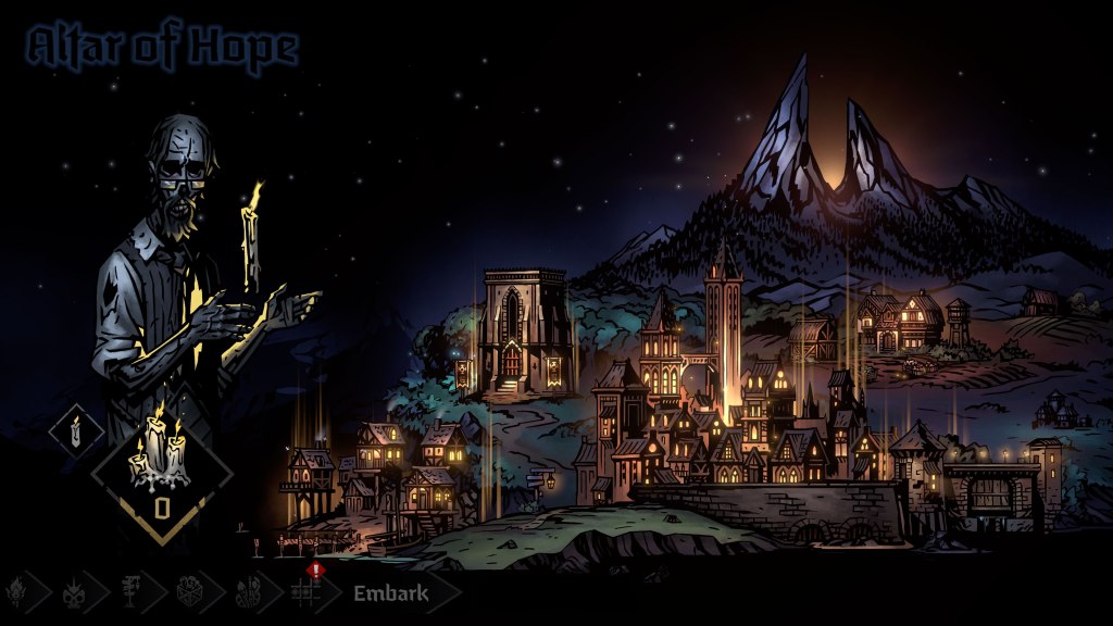 Innanzitutto, e questo potrebbe interessare anche ai veterani, Darkest Dungeon 2 é un gioco concettualmente nuovo di zecca. Lasciateci spiegare. Basandosi sul combattimento a turni del primo capitolo, Red Hook Studios ha preso una decisione coraggiosa: Darkest Dungeon 2 non è semplicemente lo stesso tipo di gioco. Invece di una campagna epica e continua in cui il vostro gruppo partiva da una base centrale e tornava con il bottino per migliorarsi, qui dovrà effettuare delle corse più brevi in diligenza verso la montagna incombente, diventando leggermente più forte ogni volta. È un duro compromesso e, sebbene venga a mancare il senso di “mondo di gioco” che riusciva a creare la città di Darkest Dungeon, questo sequel ha meno potenziale per battute d’arresto importanti da parte di brutali eliminazioni del vostro gruppo che sembravano una punizione pura e sadica. Vincerete o perderete, guadagnando candele, valuta che sblocca bonus permanenti e potenziamenti per la vostra carrozza da viaggio, nuovi tipi di eroi, potenziamenti delle statistiche e oggetti da cui attingere per i drop casuali, quindi in ultima analisi nessuna corsa sarà davvero sprecata.