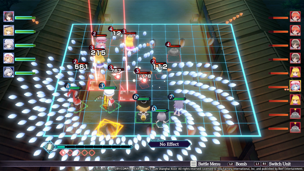 Ora, veniamo al gameplay, senza dubbio l’aspetto più importante dell’esperienza. Le battaglie in Touhou Spell Carnival assegnano a un massimo di cinque alleati il compito di sconfiggere una squadra di avversari su un campo di gioco simile a una scacchiera. Curiosamente, ci saranno due approcci al movimento e all’attacco. Il modo più veloce è eseguire una Quick Move (mossa rapida), con un doppio tocco che invierà tutti i vostri compagni di squadra Touhou verso una casella della griglia selezionata manualmente. Allo stesso modo, una Quick Graze (schivata rapida) ordinerà ai vostri alleati di spostarsi, mentre tentano di schivare eventuali proiettili nemici. Infine, un Quick Attack (attacco rapido) spedirà l’intera squadra ad assaltare una casella specifica utilizzando i propri attacchi basati su proiettili. Naturalmente, ogni manovra dipenderà dalla disponibilità di punti azione (o PA) per ogni unità. Fortunatamente, questa risorsa si ripristina gradualmente nel tempo, rendendo l’amministrazione dei PA una strategia cruciale in combattimento.