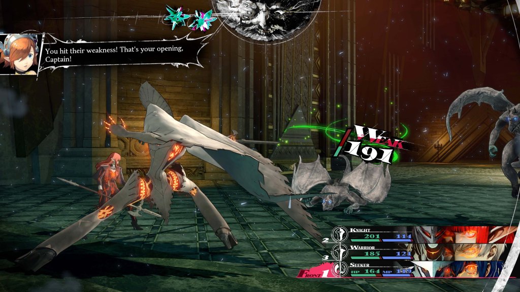 Ora, veniamo al sistema di combattimento, probabilmente la migliore versione di battaglie a turni mai creata da Atlus, incredibilmente flessibile ed allo stesso tempo molto più strategica che in passato. Il combattimento utilizza dei contatori di turni, che fluttuano come stelle nell’angolo in alto a sinistra dello schermo. I colpi critici e lo sfruttamento del punto debole di un nemico vi farà utilizzare solo mezza stella, consentendovi di colpire un nemico fino a otto volte (con la giusta pianificazione) prima che possa avere tempo di contrattaccare. Questo è decisivo, poiché completare un incontro prima che un nemico possa sferrare un colpo garantisce un sostanziale bonus di Battaglia incolume. Sarà addirittura possibile riavviare ogni singola battaglia dall’inizio, così da provare diverse strategie e sperimentare finché non troverete il punto debole di un nemico.
