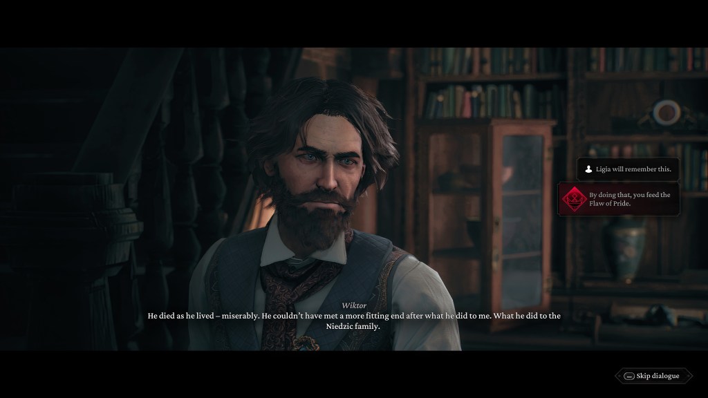 Ci è piaciuto un sacco il comparto narrativo di The Thaumaturge, ma questo non vuol dire che il gioco sia privo di problemi: sebbene abbiamo trovato interessanti molte delle storie principali e secondarie, il ritmo lento dell’esperienza significa che passerete estesi periodi di tempo a leggere e ascoltare prima di avere la possibilità di agire. Quando sarà possibile, lo farete tramite opzioni di dialogo che possono variare in base alle scelte passate o alle vostre abilità. Alle volte The Thaumaturge vi chiederà di fare delle ipotesi sulla vita di Wiktor e sulle sue vecchie relazioni per le quali, però, non avrete alcun contesto. Ad esempio, vi chiederà regolarmente di essere gentili o “decisamente ostili” (per usare un termine educato) con le persone che apparentemente lo conoscono, il problema è che voi (i giocatori) non conoscete loro ed il gioco non vi darà una ragione adeguata per decidere in un modo o nell’altro. Detto questo, ci è piaciuto che le opzioni di dialogo sembrassero regolarmente rischiose e che le limitazioni imposte dagli incontri precedenti o dalle statistiche attuali di Wiktor riuscissero a trasformare il semplice chiacchierare con le persone una “sfida nella sfida” nel contesto di gioco. The Thaumaturge mette in scena uno spettacolo convincente nel darvi il controllo sui suoi eventi.