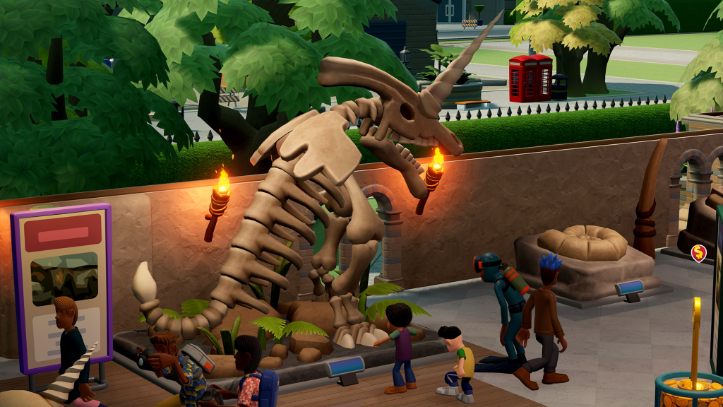 Spostare l’attenzione dalla gestione di una scuola o di un ospedale a un museo gioca a favore del titolo. Quando il vostro obiettivo è impressionare i vostri ospiti usando elaborate esposizioni, un sacco di piccole decorazioni e planimetrie che assicurano che debbano uscire attraverso il negozio di souvenir, vi ritroverete a zoomare molto in basso e a prestare molta attenzione a come tutto potrebbe apparire a livello degli occhi. Durante una delle nostre partite, nel bel mezzo di una mostra dedicata ai dinosauri, avevamo allestito un angolo dedicato a Sonic The Hedgehog, con tanto di macchina a gancio per vincere pupazzetti, negozio di souvenir a tema, tappezzeria alle pareti e pavimento in stile “Green Hill Zone” ed assistenti alla vendita in cosplay di Sonic, Tails, e Shadow (e qui dobbiamo ringraziare SEGA per averci inviato la ricca “Edizione Esploratore”). Ok quindi, “simulazione” magari è una parola un po’ forte, ma Two Point Museum è più che felice di abbracciare il concetto di stupidità a favore della realtà. E sapete una cosa? Ben venga!