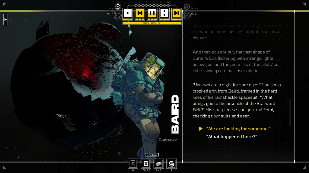 Citizen Sleeper 2 sfrutta al meglio i suoi nuovi sistemi di equipaggio, mettendo i vostri collaboratori al lavoro durante le sequenze più elaborate. Potrete portare con voi fino a due membri dell’equipaggio in missioni speciali come la demolizione di vecchie astronavi abbandonate nello spazio o la ricerca di acqua potabile su un asteroide, ognuno con le proprie specializzazioni e un paio di dadi da assegnare ai compiti. Le missioni che richiedono più mani saranno spesso più lunghe e richiederanno diversi cicli di più fasi per essere completate; ad esempio, sfondare lo scafo di un’astronave in modo che un alleato più esperto di hardware possa trovare il mainframe e prepararlo affinché il vostro hacker possa rubare alcuni dati. L’efficienza è fondamentale, perché ogni ciclo costa rifornimenti e, una volta esauriti, le cose potranno andare molto male, molto velocemente.