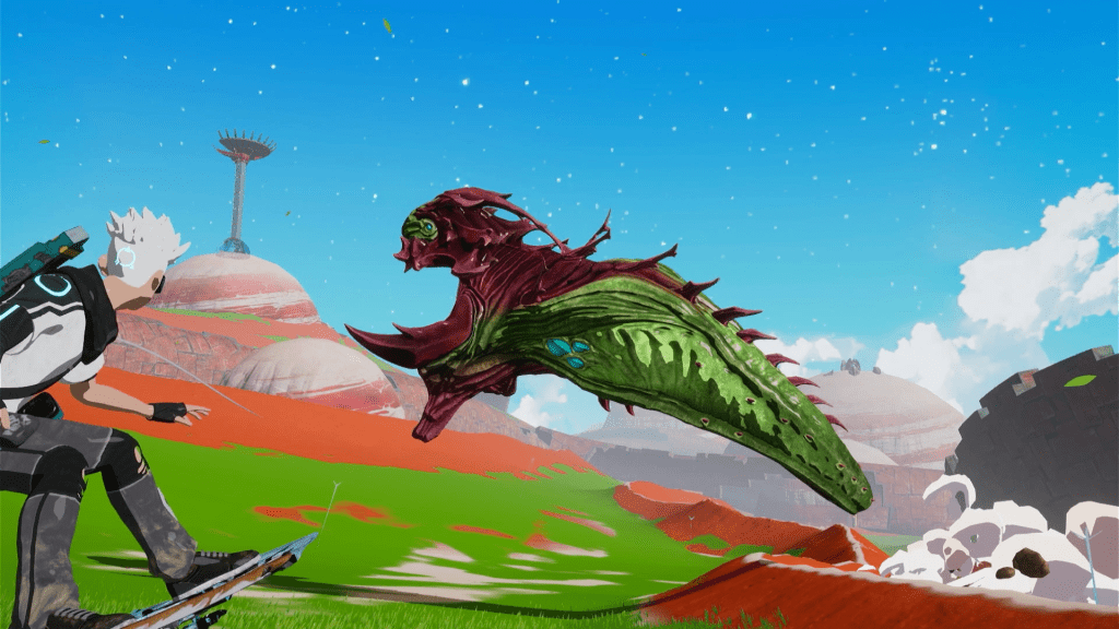 Vediamo la trama. Il gioco si apre con il personaggio principale, dal nome di Bios, che si rilassa nello spazio, con i piedi sul cruscotto della sua astronave mentre ascolta un po’ di musica synth. Improvvisamente, il sistema di comunicazione della nave capta una chiamata di soccorso frammentata da parte di Nous, la sua innamorata scomparsa, e tanto basta per Bios per lanciarsi a testa bassa nell’avventura. Chiaramente, nulla va come da manuale e dopo un atterraggio di fortuna sul pianeta alieno di Cebete, il nostro Bios recupera la sua (oggettivamente cool) spada keytar dai rottami e subito dopo viene salvato dall’hoverboard di Nous poco prima che una strana pianta aliena esploda. E’ in questo momento che si riesce a sentire la chiamata di soccorso per intero, scoprendo che Nous è l’ultima sopravvissuta di un’operazione mineraria esplorativa e che, soprattutto, è bloccata sul pianeta Cebete da ben sette anni! Quale tragedia sarà capitata agli altri minatori? Nous è ancora viva? Bios si avventura per scoprirlo e sarà qui che il gioco prenderà il via in modo canonico.