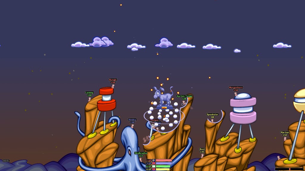Se siete dei principianti assoluti, la struttura è semplice: controllate una squadra di Worms sparpagliata su un campo di battaglia visto lateralmente e, a turno, lanciate l’artiglieria contro il nemico. L’ultima squadra che rimane in piedi vince. Le armi includono classici affidabili come il bazooka, la granata, la mazza da baseball e l’Uzi, ma anche esilaranti armi speciali come la granata sacra, una pecora esplosiva e, naturalmente, l’asino di cemento. Anche gli oggetti passivi si rivelano vitali per il vostro successo, con il teletrasporto che vi permette di sparire in un istante, e la corda ninja che vi permette di attraversare con stile mappe generate casualmente e personalizzate.