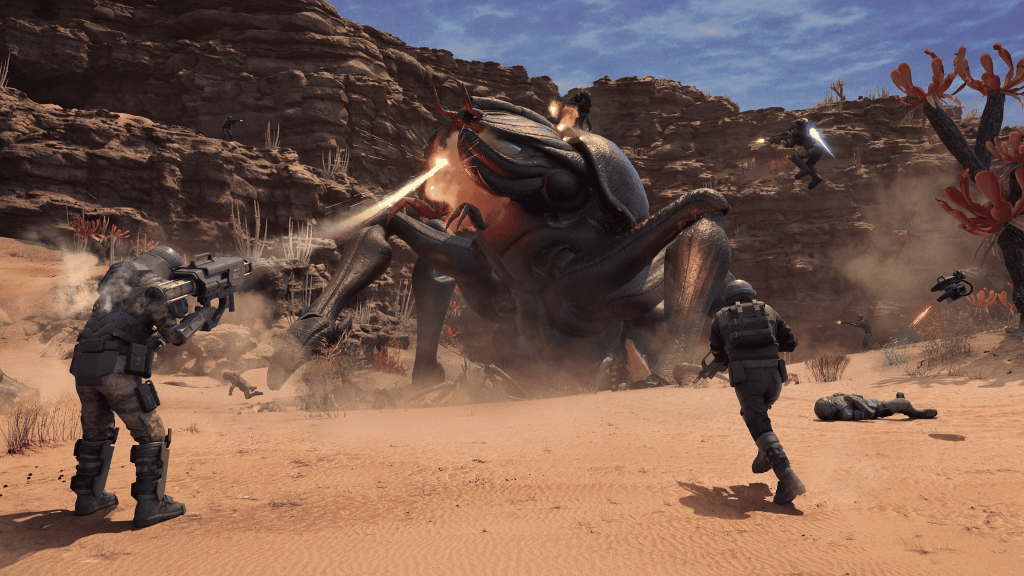 A volte compariranno pattuglie anti-insetti particolarmente potenti, a volte sarà necessario proteggere i generatori. Alcuni obiettivi secondari riducono il livello di minaccia globale, che determina il numero e la forza degli aracnidi attaccanti. Una volta raggiunto l’obiettivo della missione, la task force corre verso la nave da sbarco. Le missioni funzionano bene, ma ci si abitua a tutto abbastanza in fretta, il che non diminuisce in modo significativo il divertimento della caccia agli insetti. Certo, tutto questo alla lunga può diventare piuttosto noioso, ma la sciocca sensazione del lavorare alla “estinzione di massa degli scarabei” vi invita sempre a “fare un altro giro”. Dopo una missione completata con successo, vengono assegnati punti esperienza al giocatore, alla classe e all’arma. Man mano che si sale di livello, vengono sbloccati nuovi vantaggi, accessori, skin o equipaggiamenti speciali, che consentono ai soldati di eliminare i bug in modo ancora più efficace nella lotta per la libertà dell’umanità.