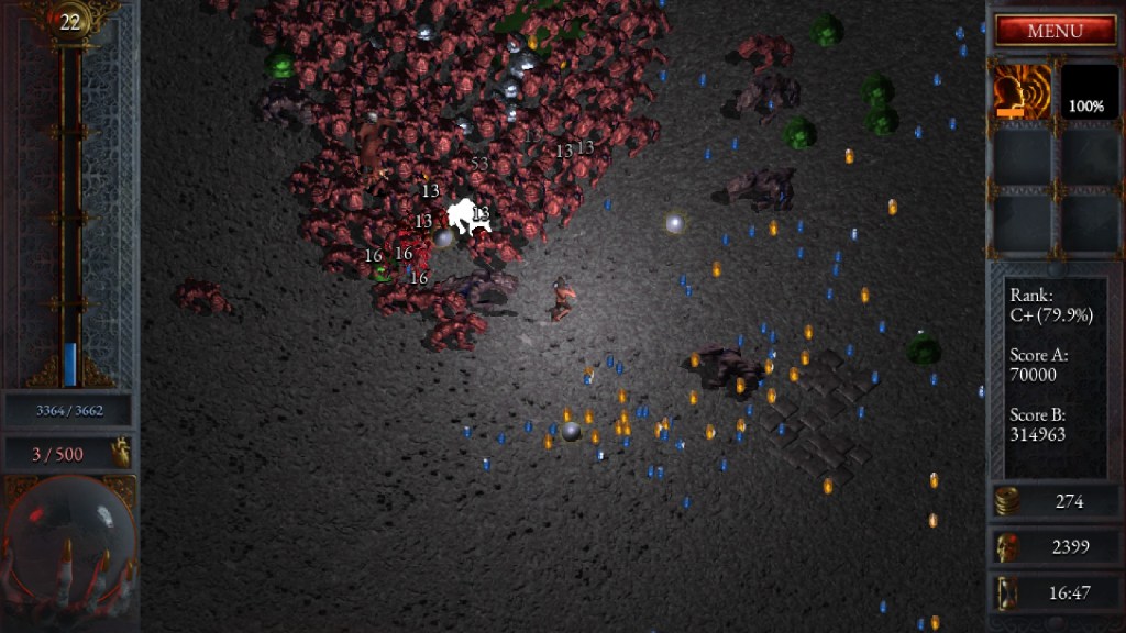 Sviluppato da Chasing Carrots, HoT è un vero e proprio tributo visivo e atmosferico ai classici di fine anni ’90, in particolare all’immaginario gotico, oscuro e isometrico di Diablo II. L’impatto visivo, con il suo look pre-rendered in stile low-res, non è una semplice scelta estetica; è una dichiarazione di intenti. Il giocatore non controlla una freccia o un’icona astratta, ma un eroe (o un anti-eroe) tangibile che si muove con peso e hitbox definiti, circondato da un gore stilizzato di ossa, sangue e demoni pixelati. Questo approccio ha conferito a HoT una profondità e una solidità che mancano alla maggior parte dei suoi concorrenti.