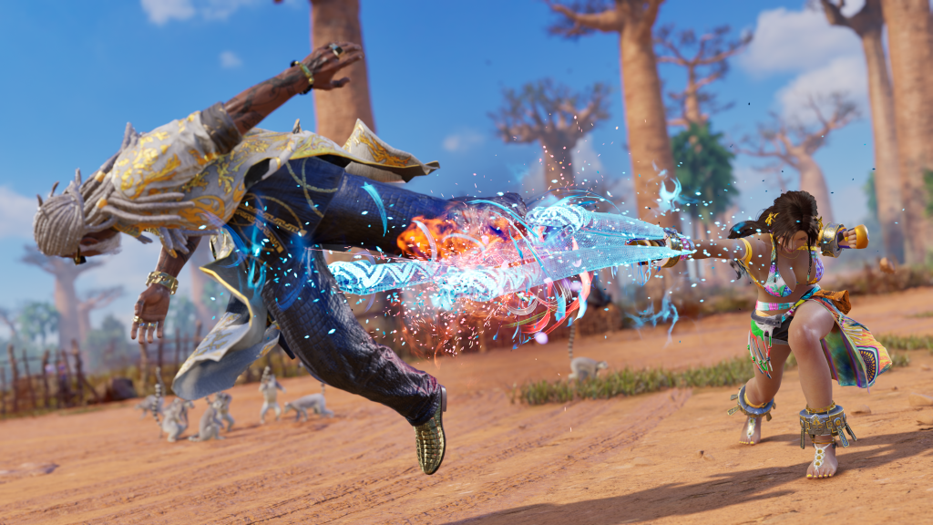 A esaltare questa estetica c’è il suo stage dedicato, il Baobab Horizon. L’arena è ambientata in una radura sacra del Madagascar, circondata dagli iconici alberi di baobab e illuminata da un sole che tramonta tingendo il cielo di arancio e viola. Lo stage non è solo uno sfondo, ma un’esplosione di dettagli naturali e culturali: si possono notare incisioni tribali sulle rocce e flora lussureggiante, che rendono omaggio alla biodiversità dell’isola. Questo ambiente agisce come la perfetta tela per i suoi movimenti fluidi e i suoi attacchi che evocano la forza della natura, immergendo completamente il giocatore nel suo mondo.