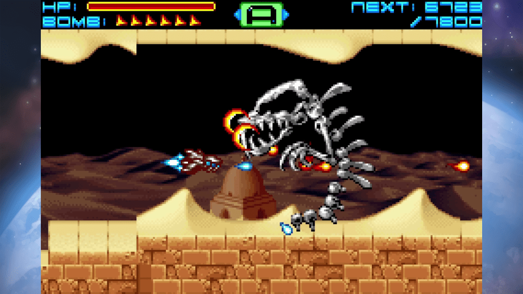 Il vero elemento di rottura di Sigma Star Saga DX rispetto ai tradizionali giochi di ruolo è il modo in cui gestisce i combattimenti casuali. Invece di scontri a turni o battaglie in tempo reale sulla stessa mappa, il protagonista viene teletrasportato all’interno del proprio caccia spaziale per affrontare ondate di nemici in sezioni shoot-em-up. Questa transizione è il cuore pulsante dell’opera. La varietà degli scontri è garantita dall’incredibile sistema di Gun Data, che permette di personalizzare il proprio armamento in modi quasi infiniti. Con oltre settanta elementi diversi a disposizione, le combinazioni possibili superano le quindicimila varianti. Il giocatore può sperimentare proiettili a ricerca, raggi laser devastanti, bombe a caduta o spari multidirezionali, adattando la propria potenza di fuoco al tipo di nemico o alle preferenze personali.
