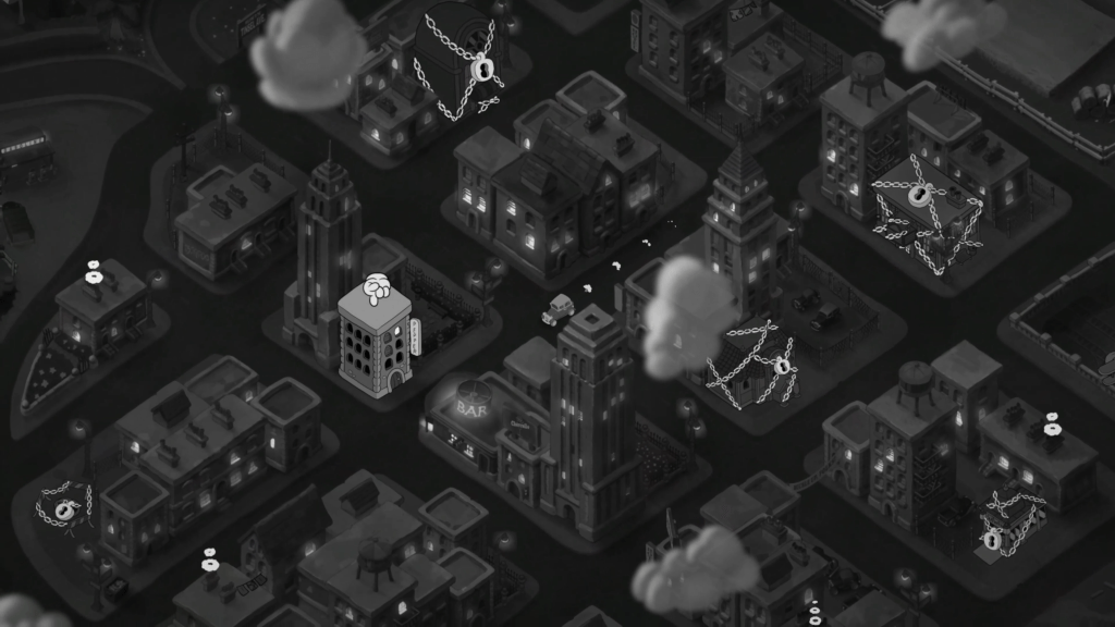 L’impatto visivo rappresenta senza ombra di dubbio il biglietto da visita più roboante della produzione. La scelta del bianco e nero, unita a una grana della pellicola che sembra provenire direttamente da un proiettore d’epoca, crea un distacco immediato dalla realtà cromatica dei titoli contemporanei. Ogni animazione è stata curata per replicare la sensazione di un disegno fatto a mano che prende vita su schermo, con quella leggera imperfezione che conferisce calore e carattere a ogni movimento. La transizione tra gli ambienti tridimensionali e i personaggi bidimensionali è gestita con una sapienza tecnica che evita qualsiasi attrito visivo, permettendo al giocatore di immergersi completamente in un mondo che sembra un cortometraggio d’epoca giocabile. La cura per il dettaglio è maniacale: dalle nuvole di fumo che si sprigionano dalle armi agli effetti delle esplosioni che si dipanano come macchie d’inchiostro che si allargano sulla carta, tutto concorre a creare un’illusione di coerenza artistica che non viene mai meno.